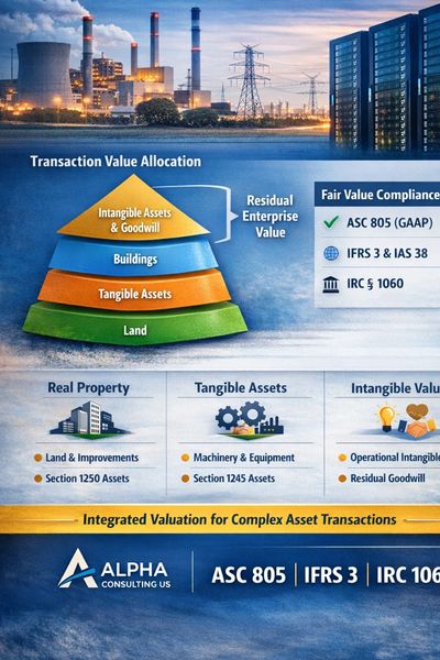 Alpha Consulting US provides integrated valuation services combining real estate appraisal, tangible asset valuation, and enterprise valuation to produce defensible allocations suitable for tax, financial reporting, and transaction documentation.